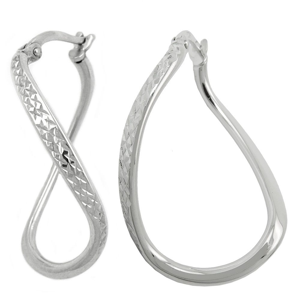 Diese hochwertig gearbeitete Creole aus Sterling Silber 925 mit Bügelverschluss hat ein besonders ausgefallenes Design. Sie ist leicht insich gedreht, die Vorderseite hat einen tollen Diamantschliff und die Rückseite ist glatt und glänzend. Die Oberfläche ist anlaufgeschützt rhodiniert. Ein glamouröses Schmuckstück für den besonderen Anlass, wunderschön auch als Brautschmuck!