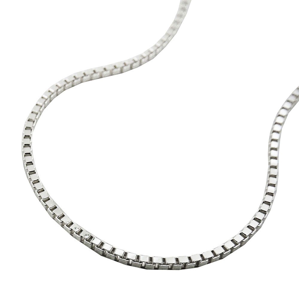 Jeder Anhänger braucht seine Kette! Dünne, stabile Anhängerkette in Sterling Silber 925, 1mm breit, 38cm lang, quadratisches Venezianer-Kettenmuster (Boxkette) in guter Juwelierqualität. Dieses Kettenmuster zählt zu den Standardkettenmustern. Die glänzende Silberkette ist gut zu kombinieren mit kleineren Anhängern in Silber 925 – ein ergänzendes Schmuckstück, das in keinem Schmuckkästchen fehlen sollte!