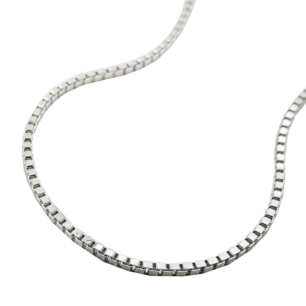 Jeder Anhänger braucht seine Kette! Dünne, stabile Anhängerkette in Sterling Silber 925, 1mm breit, 36cm lang, quadratisches Venezianer-Kettenmuster (Boxkette) in guter Juwelierqualität. Dieses Kettenmuster zählt zu den Standardkettenmustern. Die glänzende Silberkette ist gut zu kombinieren mit kleineren Anhängern in Silber 925 – ein ergänzendes Schmuckstück, das in keinem Schmuckkästchen fehlen sollte!