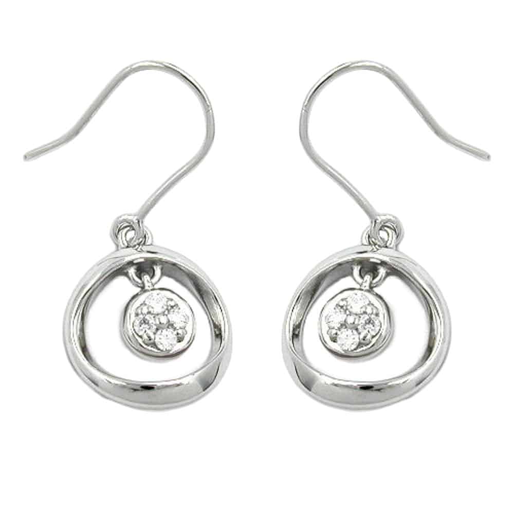 Wunderschöner, 22x14mm großer Ohrhänger in Sterling Silber 925, gearbeitet in hochwertiger Juwelierqualität. An dem Ohrhaken hängt ein 14mm großer, leicht gewellter Ring, in dessen Mitte ein 6mm kleiner Rahmen mit vier kleinen weißen funkelnden Zirkonia pendelt. Für langanhaltende Freude an diesem Schmuckstück wurde die Oberfläche anlaufgeschützt rhodiniert. Zeitlos schöner Ohrschmuck, passend für viele Gelegenheiten.